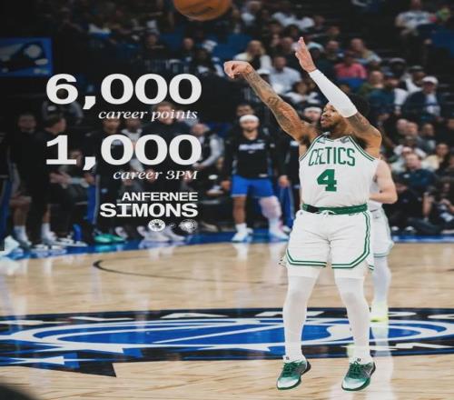 凱爾特人119-114戰(zhàn)勝熱火,完成19分大逆轉(zhuǎn)。凱爾特人后衛(wèi)安芬尼-西蒙斯替補(bǔ)出戰(zhàn)34分鐘,投籃28中13,三分16中7,罰球6中6,爆砍39分4籃板4助攻1搶斷,正負(fù)值+18全場(chǎng)第二高!得分創(chuàng)造個(gè)人賽季新高,此前紀(jì)錄只有27分。
