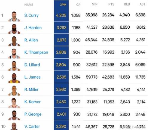 湯普森(2809個(gè)三分球)就像個(gè)神射手小火箭,“嗖”地一下,正式超越利拉德(2804個(gè)三分球),穩(wěn)穩(wěn)當(dāng)當(dāng)坐上了NBA史上三分球命中數(shù)榜單的第4把交椅,這簡直就是三分線上的“武林高手”大升級(jí)嘛!