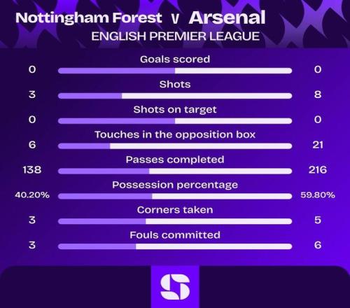 狀態(tài)不佳,阿森納對陣森林上半場8腳射門0射正