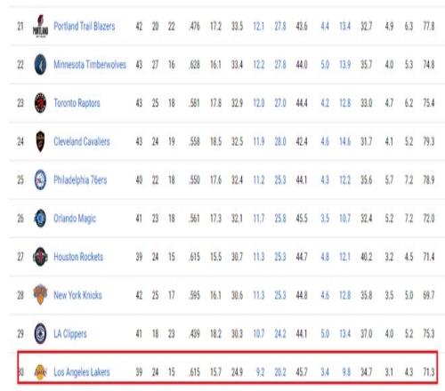 湖人本賽季場均搶到41.0個籃板球排名聯(lián)盟第26位,和球隊的防守效率一樣,也是聯(lián)盟倒數(shù)第五。都說籃板球是生命線,都說防守贏得總冠軍,偏偏湖人在這兩個環(huán)節(jié)都是全聯(lián)盟倒數(shù)的級別,談何沖擊總冠軍?