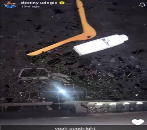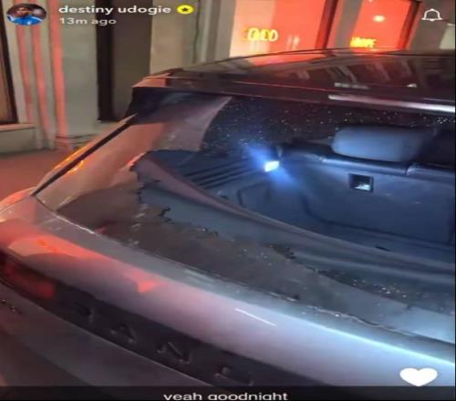烏多基曬出了自己的汽車的照片,可以看到,他的路虎攬勝后玻璃被砸碎,后備箱里還散落著玻璃碎片,旁邊還有一個(gè)木制衣架和一個(gè)水箱,他配文:“太好了,晚安”。