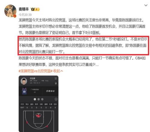 去年休賽期,陳國豪在三方交易中被送至廣州隊(duì),然而因?yàn)椤盎乇軛l款”,這哥們對陣北控隊(duì)的比賽只能打一節(jié)......