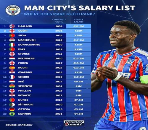 在曼城官宣格伊加盟后,德轉(zhuǎn)市場發(fā)布了曼城隊內(nèi)的年薪榜單。哈蘭德3150萬歐居首,格伊和B席1800萬歐位列次席。