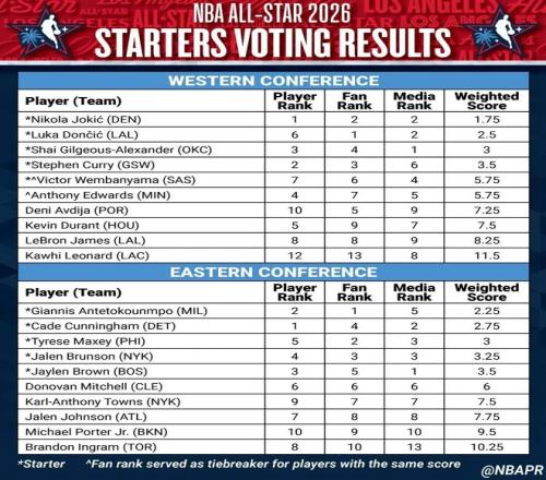 對(duì)于這套首發(fā)名單,東部名單基本屬于板上釘釘,東部五人幾乎橫掃了投票前五名。對(duì)比來看,西部名單就競(jìng)爭(zhēng)激烈不少,背后的內(nèi)容細(xì)節(jié)也更多。