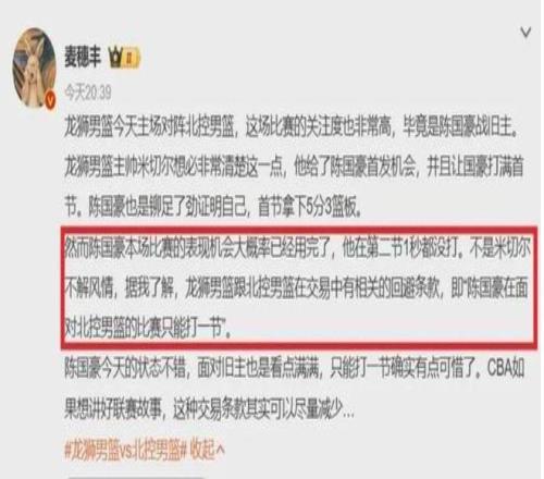 昨天晚上的比賽,廣州龍獅隊在主場以104-75大勝北控男籃,結(jié)束了球隊的3連敗。這場比賽廣州龍獅隊的內(nèi)線球員陳國豪只打了第一節(jié)的10分鐘,5投2中拿到5分3籃板的數(shù)據(jù),之后的3節(jié)比賽他一直在場邊坐著看球,再也沒有上場。于是就有球迷開始討論CBA是否存在回避條款呢?不僅是陳國豪,還有周琦和趙睿等球員此前也有類似的情況。