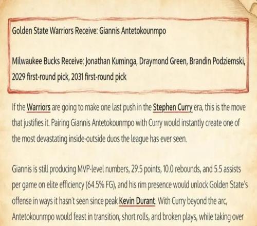 美媒《Fadeaway World》撰文建議,勇士可以打包將庫(kù)明加、格林、波杰姆斯基、2029年以及2031年的首輪簽送到雄鹿,換回這位兩屆常規(guī)賽MVP。