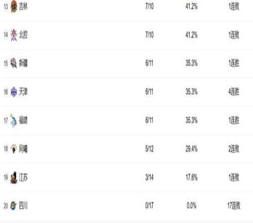 江蘇最近崛起,但這輪輸球之后停滯。四川已經(jīng)17連敗了。