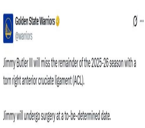北京時(shí)間1月21日,勇士官方發(fā)布聲明,前鋒吉米-巴特勒因右膝前交叉韌帶撕裂,將缺席2025-26賽季的剩余所有比賽。巴特勒是在昨日對(duì)陣邁阿密熱火的比賽第三節(jié)還剩7分41秒時(shí)受傷的,勇士隊(duì)最終以135-112獲勝。他將在擇期接受手術(shù)。