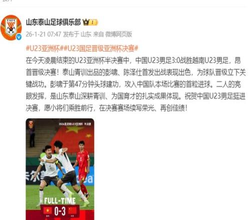 山東泰山官方對(duì)兩位小將的表現(xiàn)予以肯定:“泰山青訓(xùn)出品的彭嘯、陳澤仕首發(fā)出戰(zhàn)表現(xiàn)出色,為球隊(duì)晉級(jí)立下關(guān)鍵戰(zhàn)功。彭嘯于第47分鐘頭球建功,攻入中國(guó)隊(duì)本場(chǎng)比賽的首粒進(jìn)球。二人的亮眼發(fā)揮,是山東泰山深耕青訓(xùn)、為國(guó)育才的扎實(shí)成果體現(xiàn)。祝賀中國(guó)U23男足挺進(jìn)決賽,愿小將們乘勝前行,在決賽賽場(chǎng)續(xù)寫(xiě)榮光、再創(chuàng)佳績(jī)!”