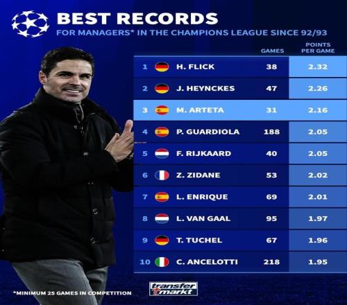 歐冠聯(lián)賽階段第7輪,阿森納客場3-1擊敗國米。據(jù)德國轉(zhuǎn)會市場網(wǎng)站統(tǒng)計,在執(zhí)教歐冠至少25場的主帥中,阿爾特塔場均積分僅次于弗里克和海因克斯。