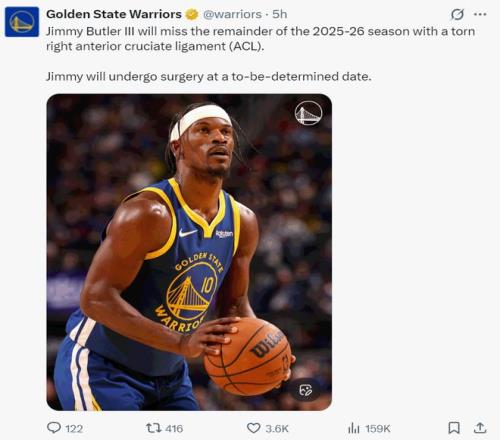 這是勇士背靠背第二場,賽前勇士官方宣布:巴特勒右膝ACL撕裂將缺席25-26賽季剩余比賽,目前巴特勒還沒有確定接受手術(shù)的時間。根據(jù)Shams的說法,巴特勒甚至?xí)毕?6-27賽季初期的一些比賽,勇士本賽季的奪冠窗口期受到巨大影響。