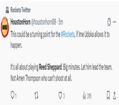 休媒:如果烏度卡能一直讓謝潑德登場,那么就可能成為火箭本賽季的一個(gè)轉(zhuǎn)折點(diǎn),應(yīng)該給謝潑德大量登場時(shí)間,讓他去掌控球權(quán),而不是給阿門那種不會投籃的球員核心席位。
