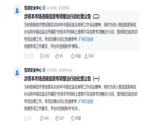 1月20日,雪球平臺發(fā)布了兩則專項整治行動處置公告,對多位平臺“大V”進(jìn)行封禁。