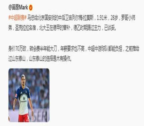 吉列爾梅-拉莫斯現(xiàn)年28歲,正處正打之年,身高1米91,德乙時(shí)期踢過主力,希望能防住韋斯利、費(fèi)利佩等外援。另據(jù)媒體人苗原透露,國(guó)安談妥的這名漢堡中衛(wèi),年薪不高,還曾被推給山東泰山。對(duì)此,有泰山球迷表示:“我們有彭嘯了,不要這個(gè)了”。其實(shí),也要一名高性價(jià)比中衛(wèi)。