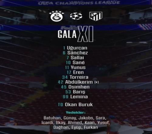 加拉塔薩雷首發(fā):1-恰基爾、17-埃爾馬利、42-巴爾達(dá)克奇、6-達(dá)文斯-桑切斯、7-羅蘭-紹洛伊、34-托雷拉、99-勒米納、10-薩內(nèi)、11-阿克金、53-伊爾馬茲、45-奧斯梅恩