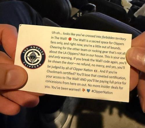 為其他球隊(duì)加油,或者穿著與洛杉磯快船無(wú)關(guān)的裝備?在我們這里不行。這是我們唯一的警告。如果你再次違反‘墻’的規(guī)則,你將被請(qǐng)出場(chǎng)——不退款,不留情面,是的,你會(huì)受到所有快船球迷的審判。如果你獲得了Chuckmark認(rèn)證(快船死忠區(qū)域成員資格)?你將失去這項(xiàng)令人垂涎的認(rèn)證,失去進(jìn)入‘墻’的資格!而且從現(xiàn)在開(kāi)始,你將全價(jià)購(gòu)買(mǎi)特許經(jīng)營(yíng)商品。你再也沒(méi)有內(nèi)部?jī)?yōu)惠了。警告過(guò)你了!#快船國(guó)度”